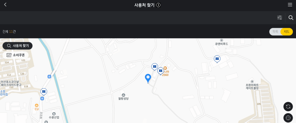 - [혜택] → [사용처 찾기] 선택