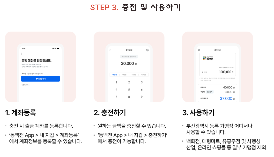 - 오프라인 결제만 가능하며, 온라인 결제 시에는 동백전 앱에서 카드번호를 직접 입력해야 합니다.