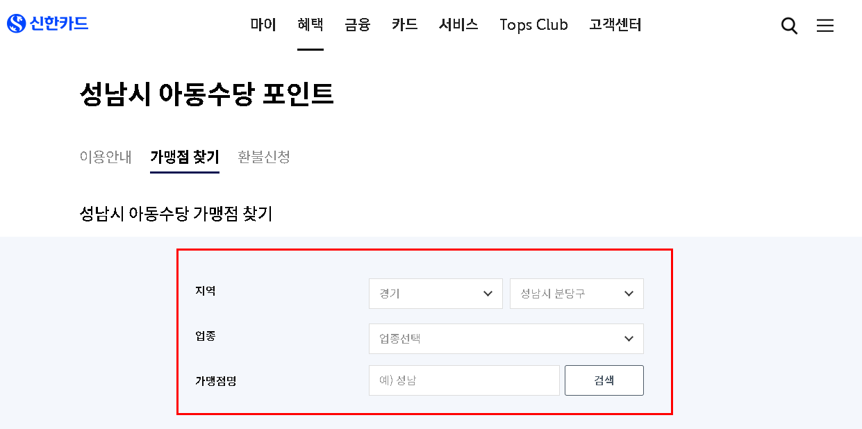 성남시 아동수당 포인트는 성남시 내 지정된 가맹점에서만 사용 가능합니다. 사용 전, 신한카드 홈페이지의 가맹점 찾기를 통해 확인하시기 바랍니다.