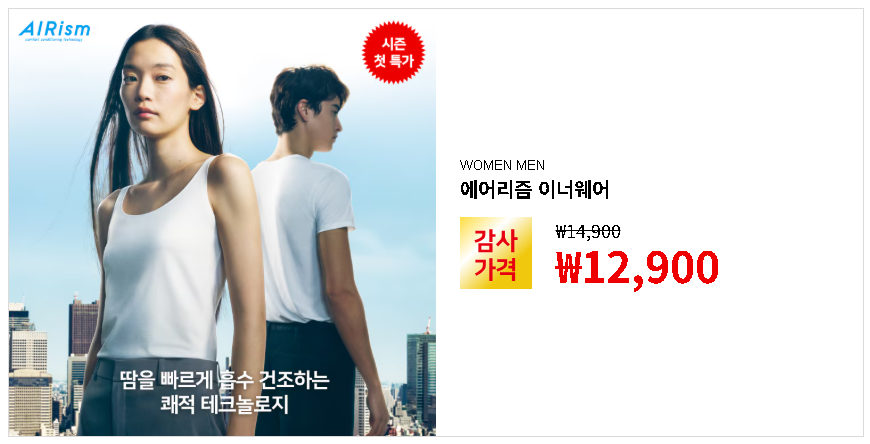| 이너웨어 | 에어리즘 이너웨어 (남성) | ₩14,900 | ₩12,900 |