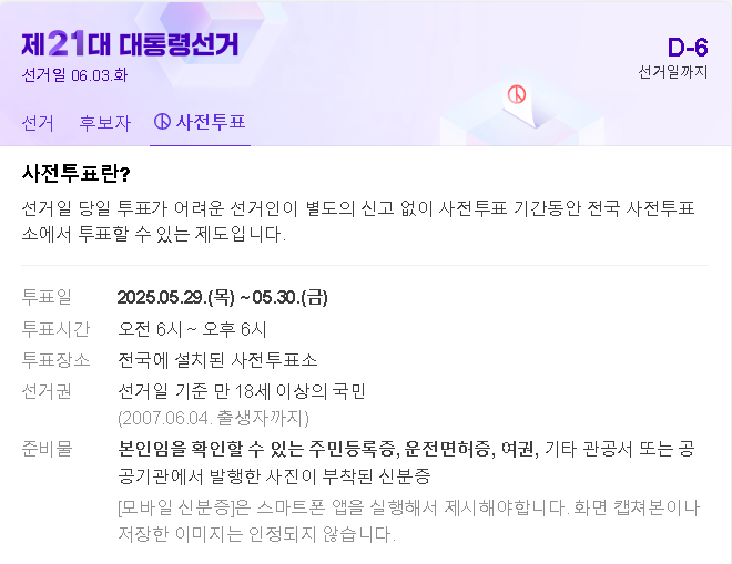 제21대 대통령선거 사전투표가 2025년 5월 29일(목)과 30일(금) 양일간 오전 6시부터 오후 6시까지 진행됩니다. 사전투표는 전국 어디서나 가능하며, 본인 확인이 가능한 신분증만 지참하면 됩니다 .