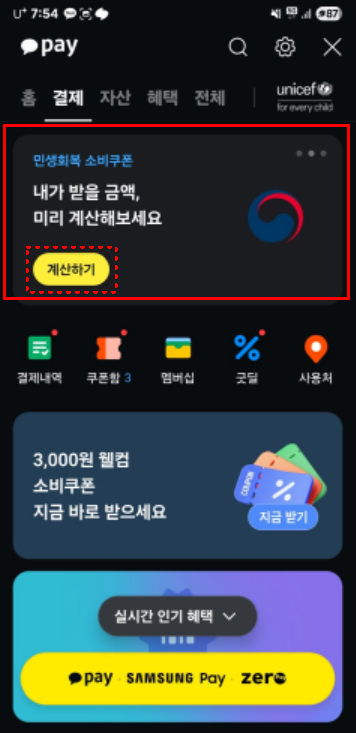 1단계. 카카오페이 앱 접속 → 검색창에 ‘민생지원금 계산기’ 입력