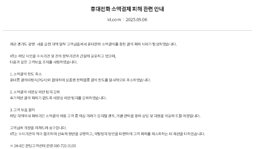 - KT·알뜰폰 고객 → 반드시 소액결제 차단 또는 한도 0원 설정