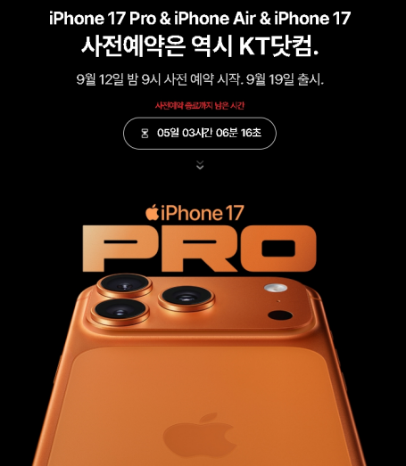 애플의 최신 플래그십 스마트폰 아이폰17 시리즈(에어·프로·프로맥스)가 드디어 공개되며, 국내 통신사 중 KT가 발 빠르게 사전예약 혜택을 선보였습니다.